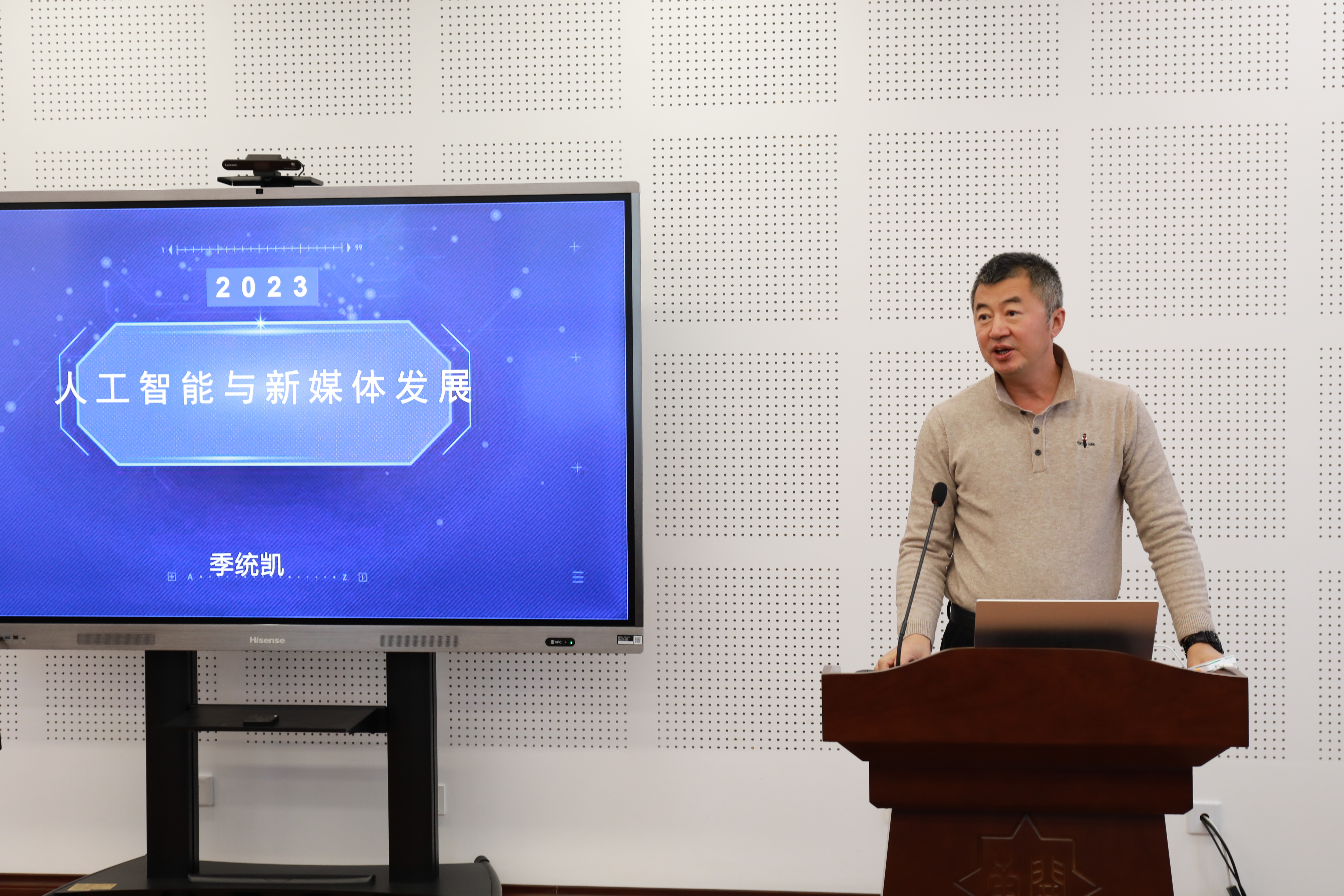 On the basis of discussing issues related to artificial intelligence, Ji briefly expounded the concept, characteristics, and development forms of new media, saying media, as a means of communication, shows a trend of increasing generalization and popularity. He encouraged students to broaden their horizon in learning and research.