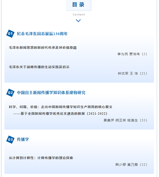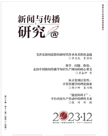 Journalism & Communication is the top academic journal of journalism and communication in China, and is headed by Chinese Academy of Social Sciences (CASS), sponsored by CASS Institute of Journalism and Communication Studies. The journal was founded in 1994, and its predecessor, Journalism Studies References, is an influential publication in the field of Chinese journalism history. Since its establishment, Journalism & Communication has inherited and carried forward the tradition of valuing academic research, with the pursuit of representing the highest level of academic research in China’s journalism and communication, leading the development direction of academic research in China’s journalism and communication. The journal has been expanding its coverage of research and maintaining close contact with the international academic community, has published a series of influential academic papers, and has been highly lauded by the academic community.
