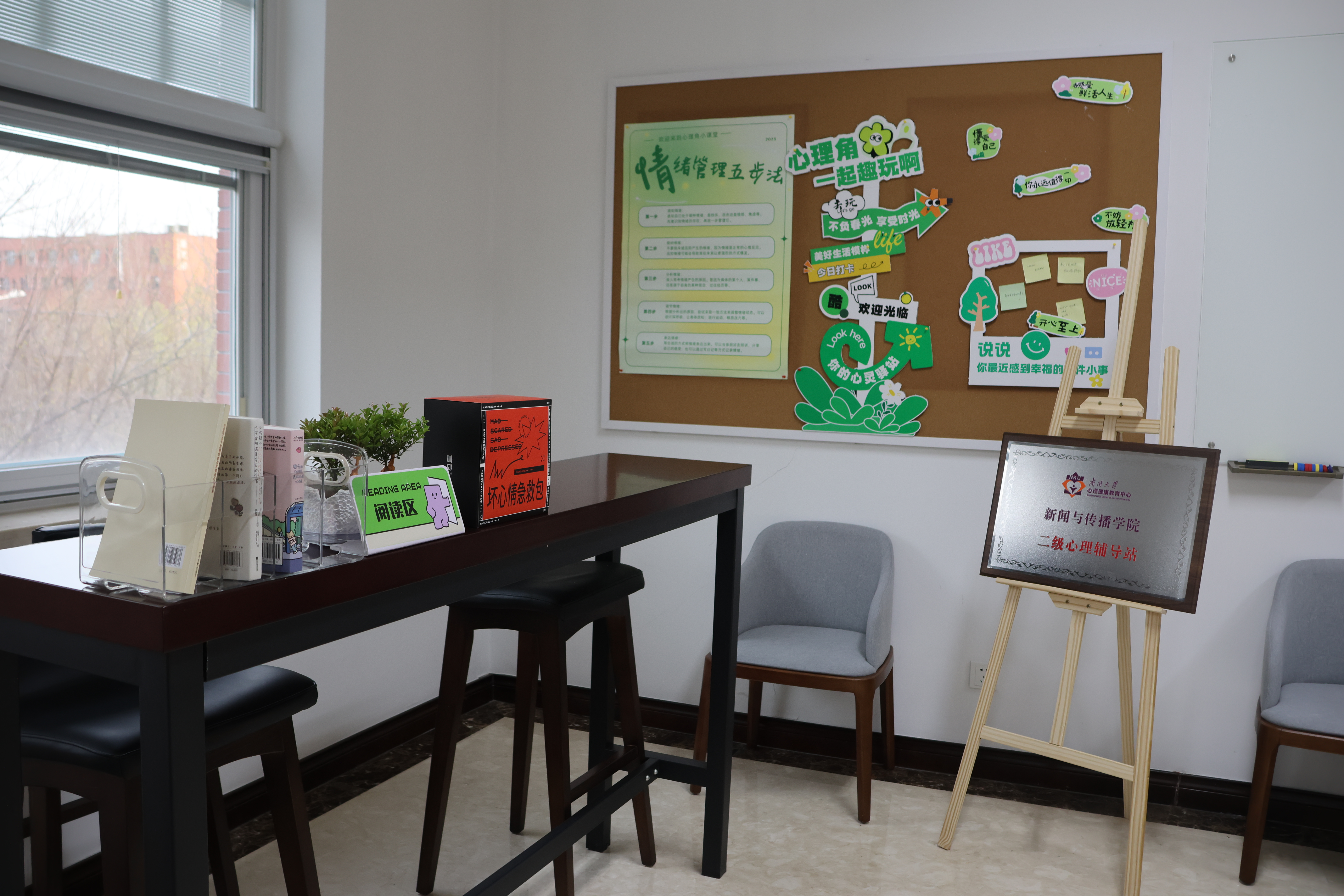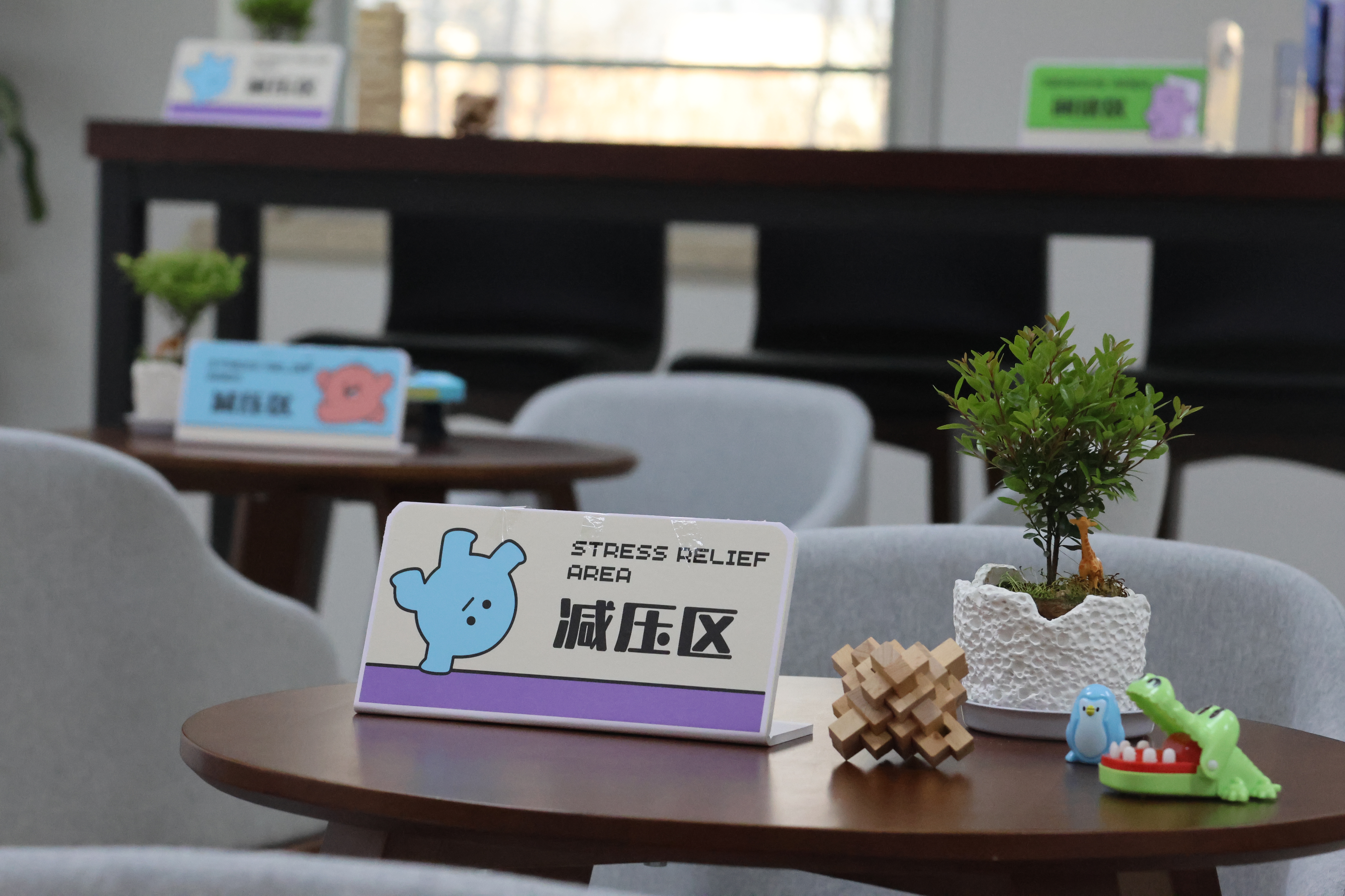 Recently, the eastern corridor on the second floor of Xiushan Hall at NKU School of Journalism and Communication underwent a quiet refresh. Green-toned psychological knowledge display boards, shaped like a thriving tree, now adorn the space, complemented by neatly arranged lounge chairs, potted plants, and a variety of stress-relief toys and psychology books on the tables. Students passing by stop to peruse the illustrated guides on Emotional Management Techniques on the boards or engage in conversations in the verdant corner.