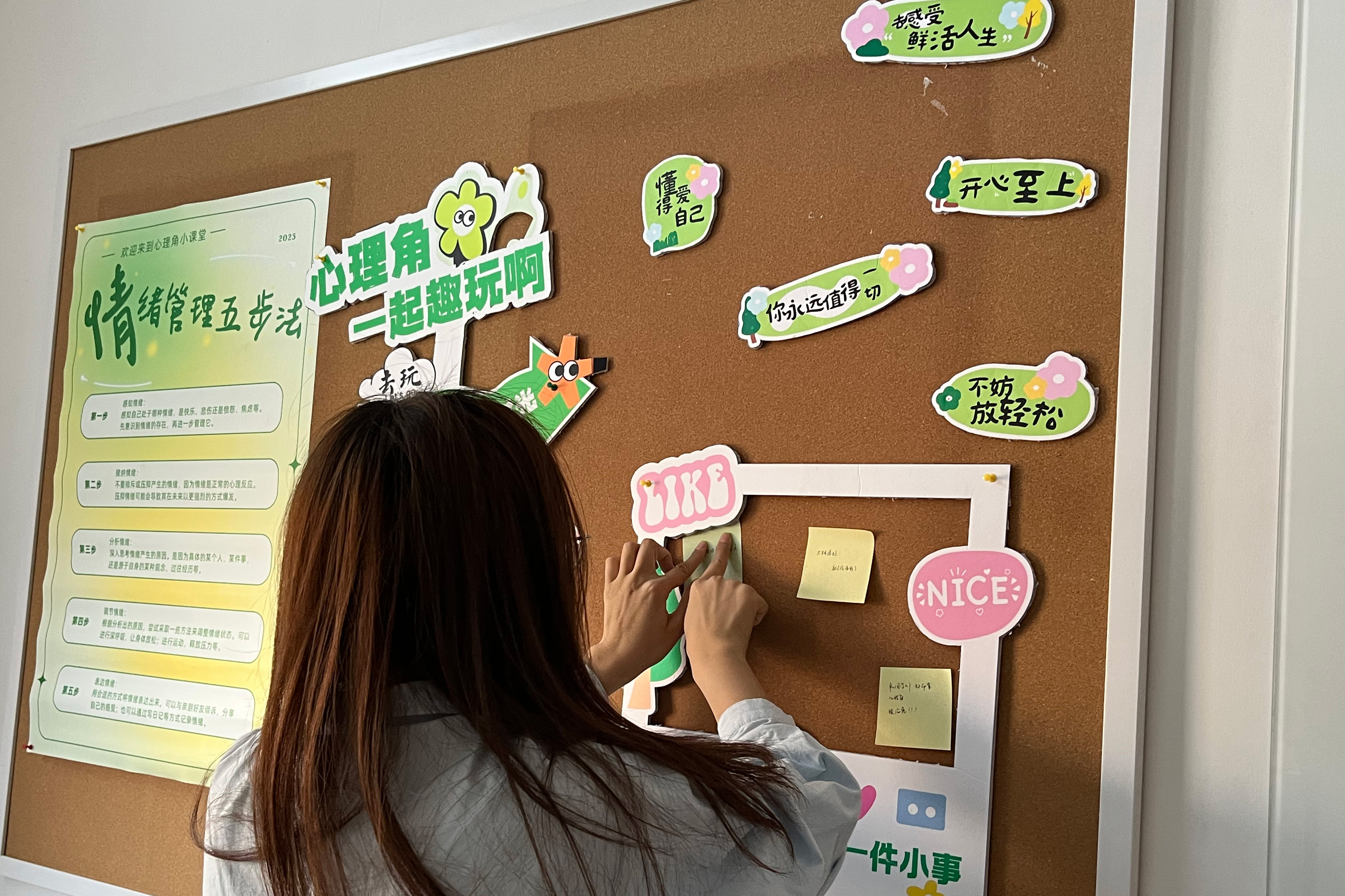 The design plan for the Psychological Corner had undergone multiple revisions. The first phase divides the area into sections for interactive exchange, emotional counseling, and psychological education, featuring mental health education display boards, positive psychology books, and stress-relief toys. The education display boards offer practical tips such as Guidelines for Addressing Common Psychological Issues and Five-Step Emotional Management Techniques. Students can not only study the materials, but also leave messages in the interactive zone, sharing their moments of happiness and warmth. The leisure and stress-relief zone, with its soft hues and lush greenery, creates a relaxing atmosphere where students can take short breaks and engage in self-regulation.