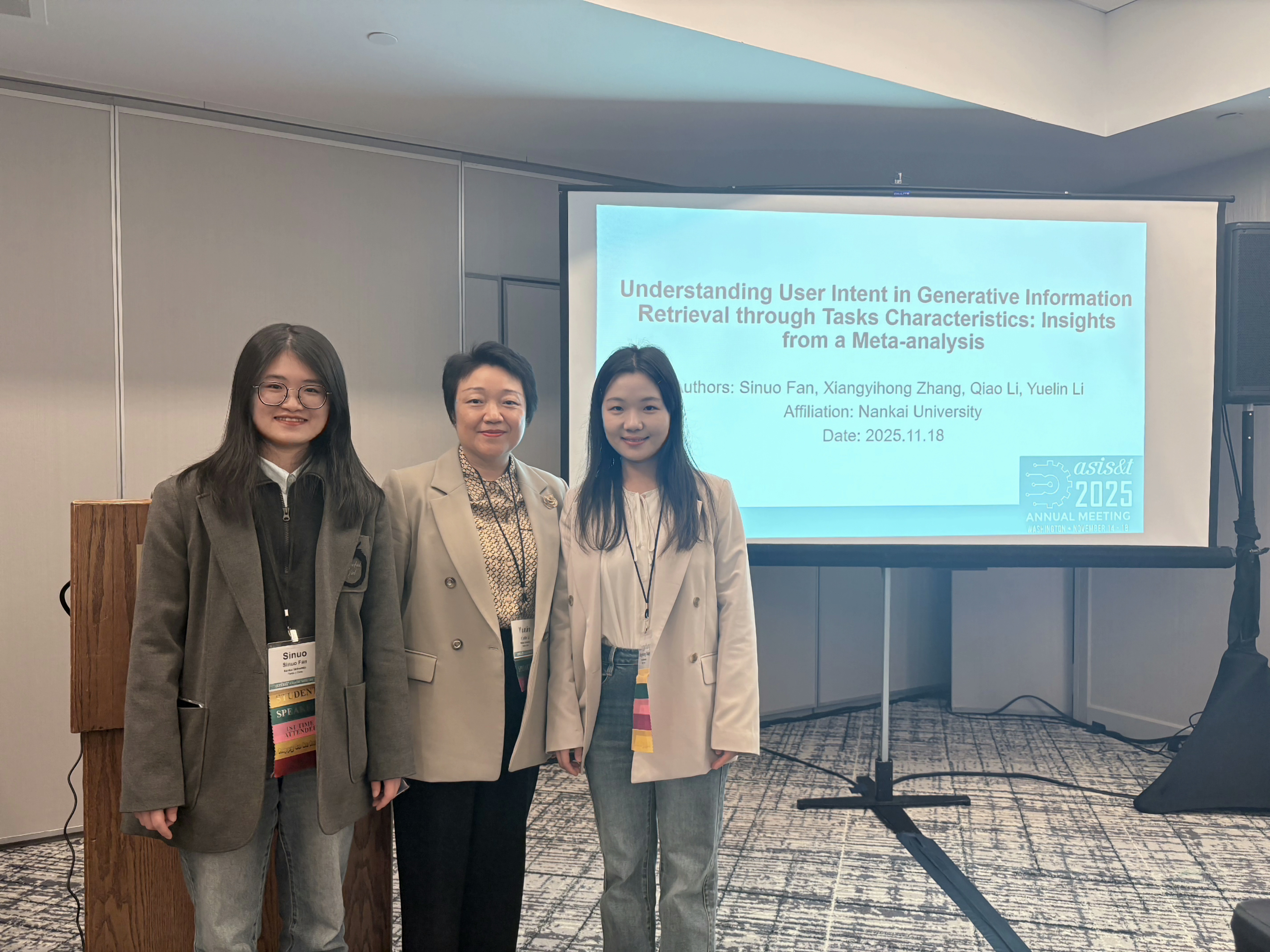 From November 14 to 18, 2025, the 88th Annual Meeting of the Association for Information Science and Technology (ASIS&T) was held in Washington, D.C., USA. Professor Li Yuelin, Dean of the School of Information and Communication, NKU, led doctoral students Fan Sinuo and Zhang Xiangyihong from the Department of Information Resources Management to attend the conference, fully engaging in international academic exchanges.